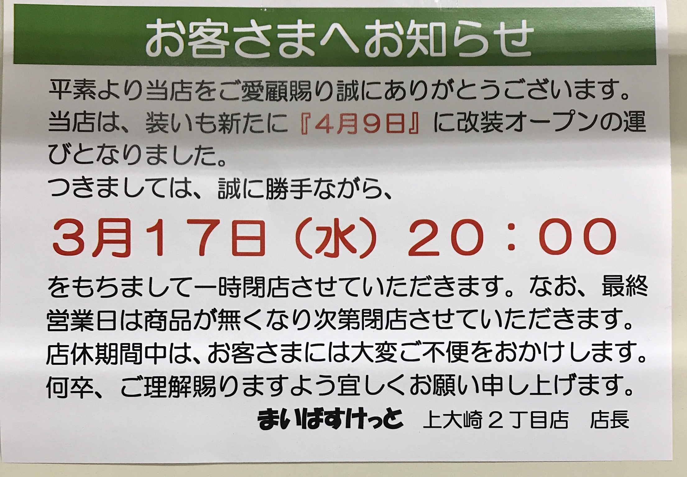 改装の為、17日で一旦閉店とか。