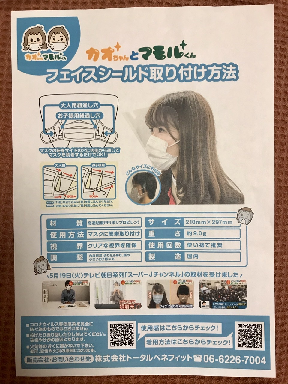 マスクのゴムを通して装着するタイプの新しいフェイスシールドをいただきました。