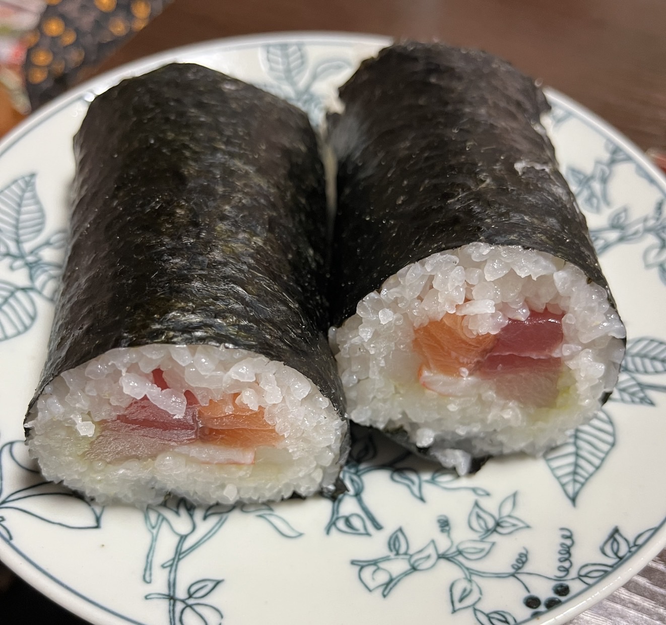 なんとか、酢飯パック100円、棒状に切られたお刺身、海苔を買い、自分で巻きました!