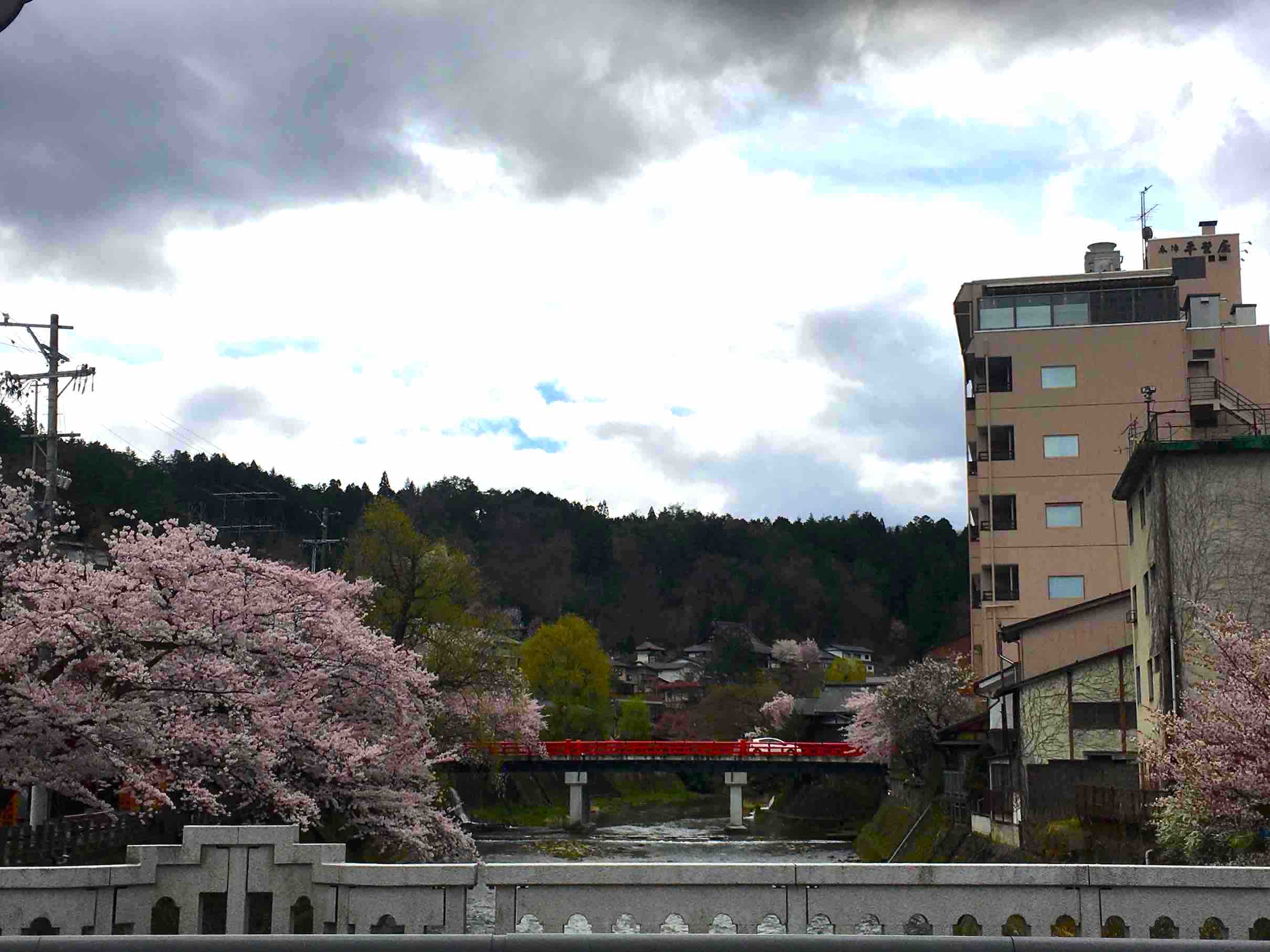 赤い中橋の手前の、みそかい橋からの景色。桜満開ですemojiemoji